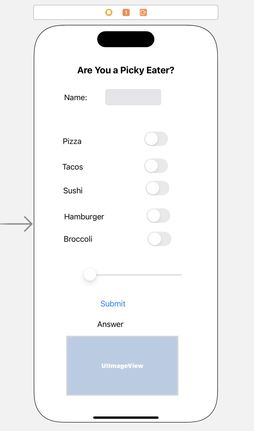 That’s it. You’ve created a simple quiz that lets users determine if they are picky eaters. This demonstrated our use of Labels (that can be used as Outlets), Switches, Sliders, Buttons and using if statements to display an answer. It also demonstrated how to programmatically change an ImageView. Of course you could do much more to add logic or different types of calculations to make this more interesting, so be creative. But you now have many options for creating your own application.